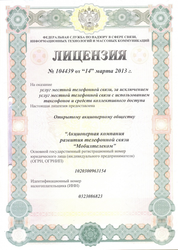 Лицензия Федеральной Службы по надзору в сфере связи, информационных технологий и массовых коммуникаций №104439 от 14.03.2013г.