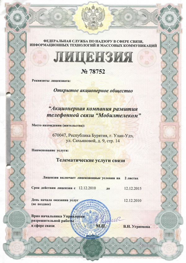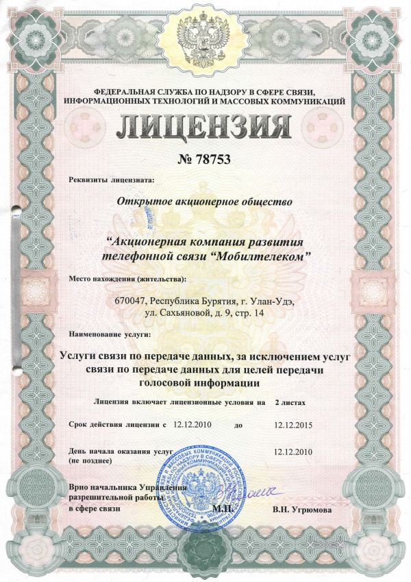 Лицензия Федеральной Службы по надзору в сфере связи, информационных технологий и массовых коммуникаций №78752 от 12.12.2010г.